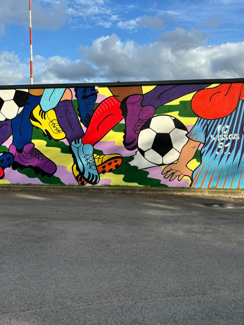 Fresque sur le mur du club house du FC Wissous, club associatif et familial, emblématique de la petite ville. Réalisée à quatre mains avec Romain Roulin, graffeur et co-auteur du livre Pour Ceux, histoires du graffiti dans le Val de Marne, 2020